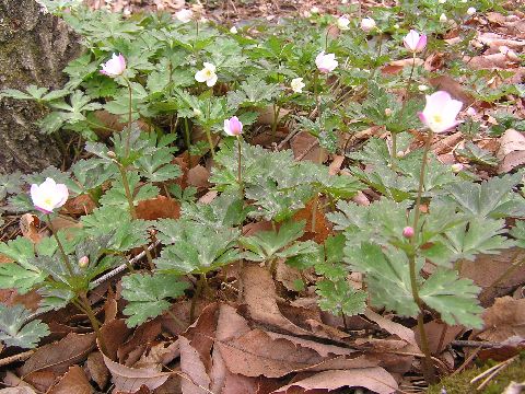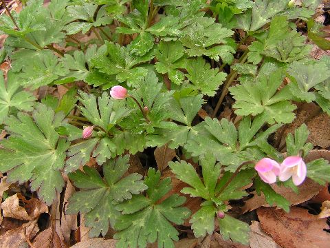 ニリンソウが彼方此方へ飛んで飛んでそれぞれの場所でさきはじめています。なかには綺麗なピンク色のものもあり、とても可愛い花です。
