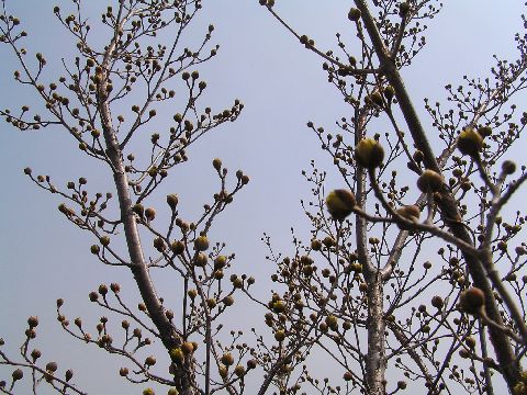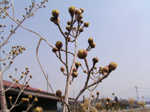 農家の畑にサンシュウユのつぼみが膨らんでいました。