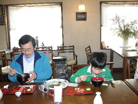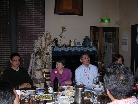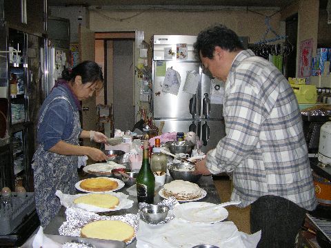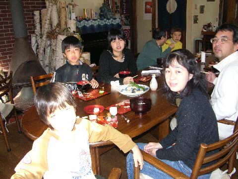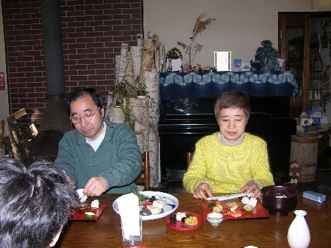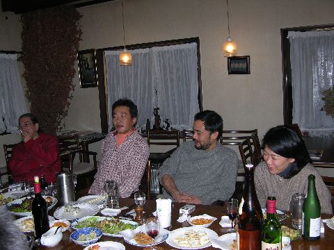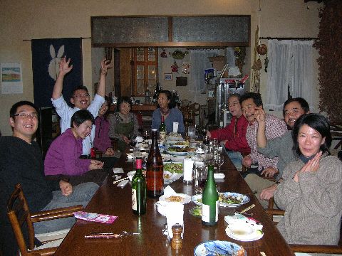 年末の忘年会・・・それは夜の10時から始まりました。皆さんお仕事を終えて東京を出発!! の為此の時間に・・・・。テーブルにはワイン・日本酒・焼酎・ウイスキーと並びます。呑む程に酔うほどにだんだん盛り上がり陽気になって見ている我々もいつの間にか輪の中に入っていました。時の経つのも忘れ、最後の人は朝の6時だったそうです。
