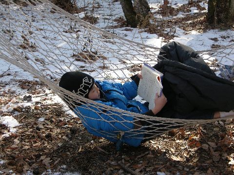 はずし忘れたハンモックで、ハリーポッターの本を読む少年!! 200ページもある本を抱えて暖かい日差しのなかで・・・なかなか良い光景でした。これからスケートに行くそうです。