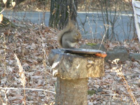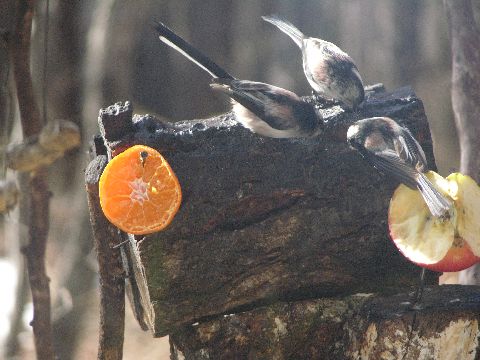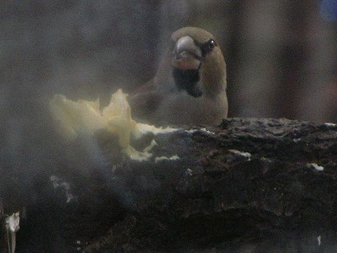 今日は朝食の後にコゲラ・エナガ・シメ・アカゲラ・シジュウカラ・等が入れ替わり立ち替わり餌台にやってきました。リスもやってきて、カメラポーズで10分ほど座っていてからやおら餌を食べ始めました。あまりの可愛さに、お客様は30分お帰りをのばされました。