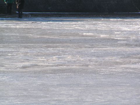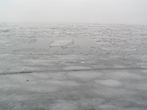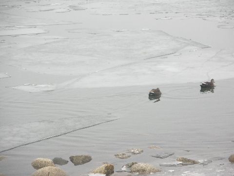 昨夜からの、気温の上昇で所々部分的に解けていましたがかもが遊んでいてなんだかのどかな風景でした。青い空と白い氷だったら尚良かったとは思いますが曇って霧に覆われている状態でしたが、より寒々とした感じがでていて感動しました。