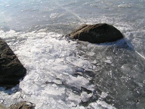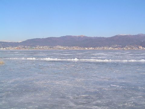 朝−9度。8時に諏訪湖へ、矢張り青い空と白い湖もみたくて・・・。周りの氷はかなり厚みがありそうで、あるいてみましたが時折ぎしぎし、ごう、と氷面下で氷の動くような不気味な音が・・・・。怖くなり慌てて岸に!! 立て看板があり諏訪湖の結氷はあつみが平均していないので歩かないようにと・・・納得!!