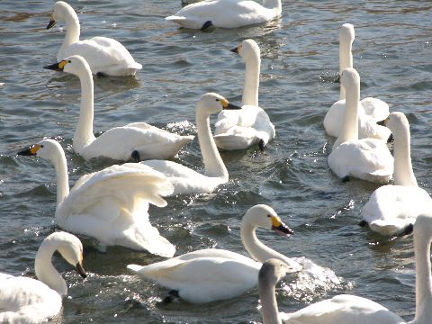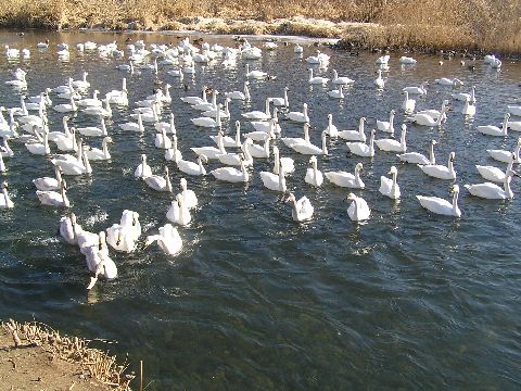 諏訪湖からの帰り路茅野あたりの川沿いに10年前から来ているという白鳥を見に行きましたが、賑やかに泣いていました。毎朝6時に来て餌を与えて数を数えて居る方が二人居られましたが500羽来ているとのことでした。餌の食パンを買い大きいまま円盤のように投げるとかなり遠くまでとどきます。ウイークデイなのに近辺から次から次ぎえと人が絶えません。車に乗って帰りかけたら前方から白鳥が5羽も飛んできました。本当に2,3分の差で撮影出来なくて、ザ・ン・ネ・ン・でした。