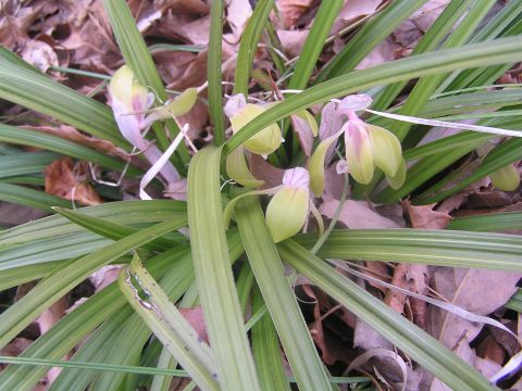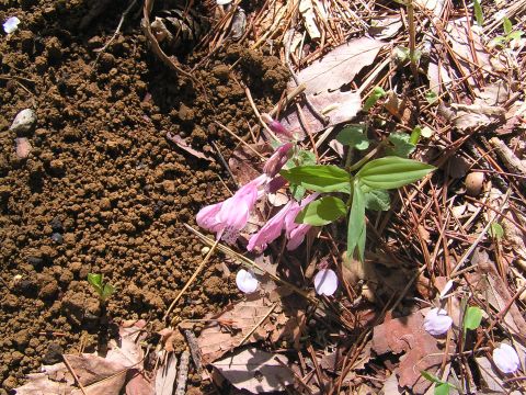 ラショウモンカズラの紫色とピンク色が咲き始めています。ほんの少しですが増えています。それにチゴユリが密やかにうつむいて咲いています。