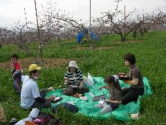 ふたを開けると思わず美味しそう!!綺麗!!桜の花が入っている!!これが1000円なら安〜〜い!!の声。2時頃になりお腹ぺこぺこ。桃の木の下でのお食事は最高!!お腹が満足してやっと周囲を見渡す余裕ができ、桃の花が沢山開いているところでパチリ・パチリとシャッターの音!!帰りには、8分先の木も何本もあり