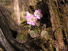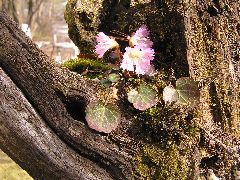 以前散歩の時に見つけた木の根っこ、ちょっと重かったのですが、欲と二人ずれで、持ってきました。そこに丁度穴があいていたので、そこに買ってきたイワウチワとユキワリソウを植えましたがイワウチワだけが根付きそのまま外に出したまま忘れていましたら3月頃から何となく葉が生き生きしてきてはなめがだんだん膨らんで来て色づいてきて可愛い花が咲きました。お客様に、いわかがみは山でよく見るけどイワウチワはあまり見れないですよ、といわれたり、若い方から図鑑では見ていますが実物を見るのは、初めてですと喜ばれたり、花のお陰でお話が弾みます。