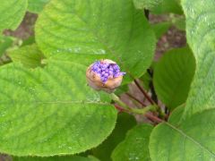 初めて此の蕾を見たときは葉はアジサイのようだけど・・・と調べてみるとタマアジサイでした。その時頂いた木が年々大きくなり、増えてきて今年はまあるい可愛いつぼみを沢山付けました。そのからがはづれて、薄紫色の小さな蕾が沢山顔を覗かせています。このころが一番可愛くて私は好きです。これが段々開いてくるとガクアジサイと同じ様になります。