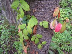 枯れて枝を切った桜の木にからみついたツタが、なんと色づいていますよね!! 早すぎますよね!!