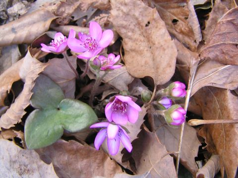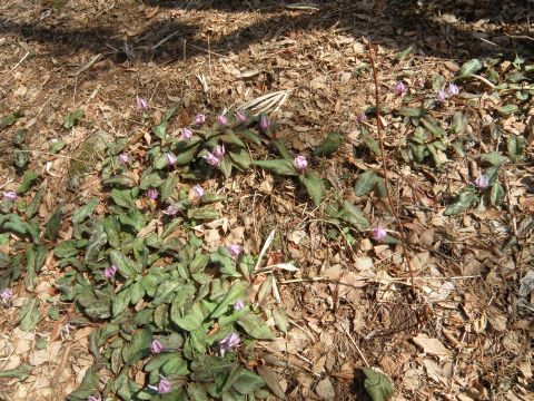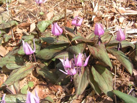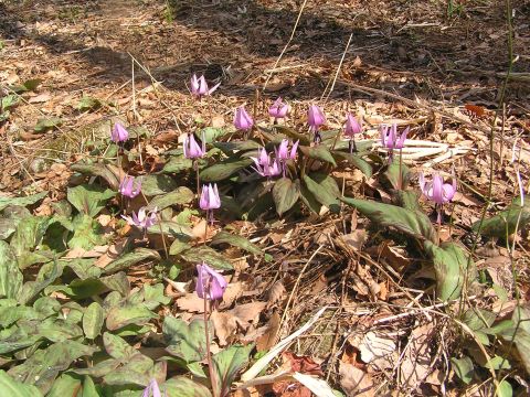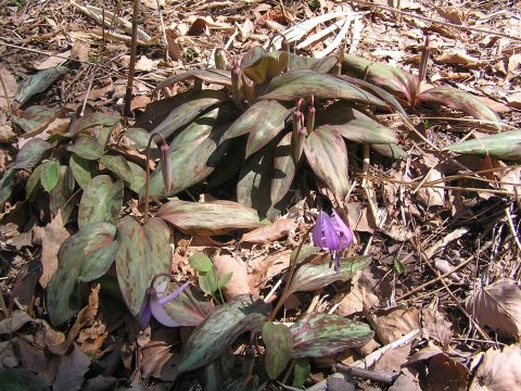 暖かさに誘われてカタクリの花が一斉に咲き始めました。年々増えてきて広範囲に???広がってきています。おもいがけないところにも1枚葉が・・・・。