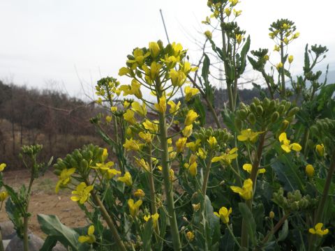 暖かさに誘われて、新府の桃の里へぶらり散歩に出かけました。予想どうり桃はまだまだ硬い硬い蕾でしたが1箇所だけ1本軒が赤い蕾をつけているものが・・。歩くうちに作業をされている農家の方とのお喋りの中1週間ほど遅れそうだとのこと、当地の桃の花祭りも17日だそうです。菜の花を摘ませていただき、夕食は華やかに・・・・。