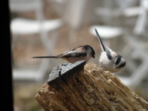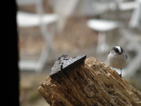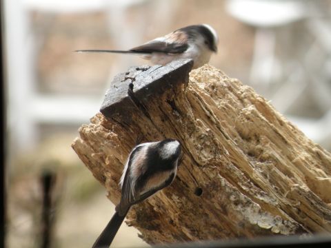 窓のそばの朽ちた切り株のところで遊んでいます。2羽で懸命につついています。暖かい春の日差しを浴びて楽しそうですね〜〜〜〜〜。