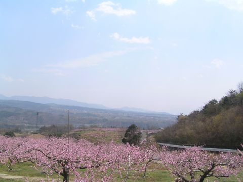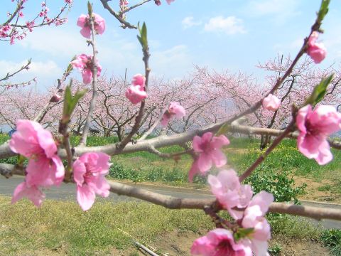 お客様をご案内して新府の桃の里へ・・・。5月末の気温だとかで、汗ばむほどの気温でした。今年は少し遅れていて、まだ満開ではなく、8分くらいでしょうか?場所によってはまだ蕾の木も・・。まだ暫く楽しめそうです。