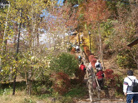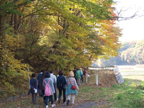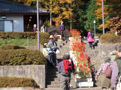 朝から晴れて春のような暖かさのなか6台の車に分乗していざ出発です。今紅葉の真っ盛り、ワクワクしながら、お喋りしながら40人ちかい人達と歩き始めます。青い空に紅葉、田園風景の中、登り、下りあり、汗ばむほどの暖かさです。