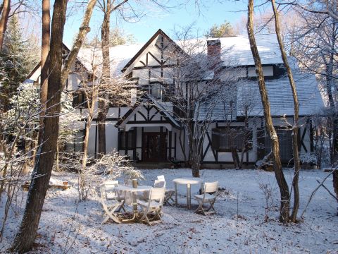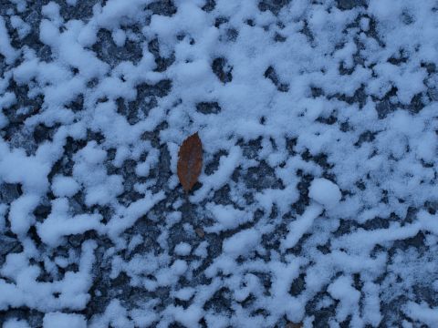 おきると庭はほんのり雪景色!!だんだん晴れてきたものの、気温が低いので解けませが、青い空と白い雪とのコントラストがとても奇麗です。
