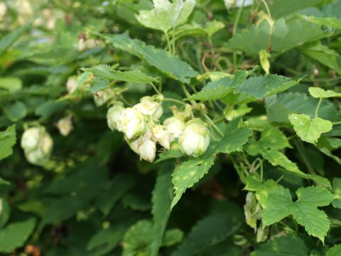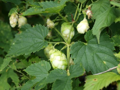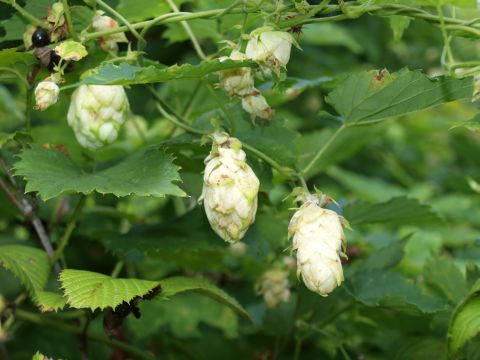 駐車場の木に絡まってえっつホップ???ここ7,8年見たことが無かったホップが絡み付いていました。昔々咲いていた場所に20年もたってさくとは???