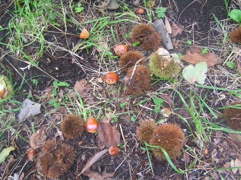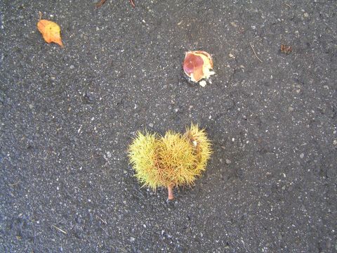 昨日から今朝まで、降り続いた雨も昼前には上がりときおり青空も・・・・。近くのクリの木に小さな栗がたった1個ついていて、下には落ちて踏まれたクリや、反対側には沢山はじけて落ちたものも・・・・。でも皆んな虫が入っています。