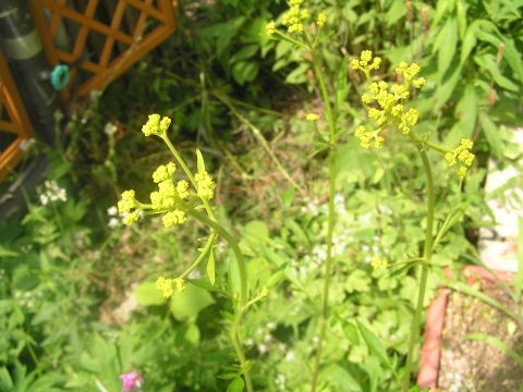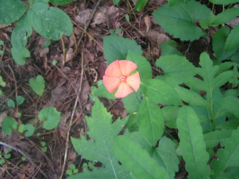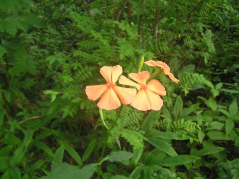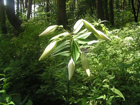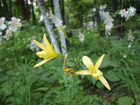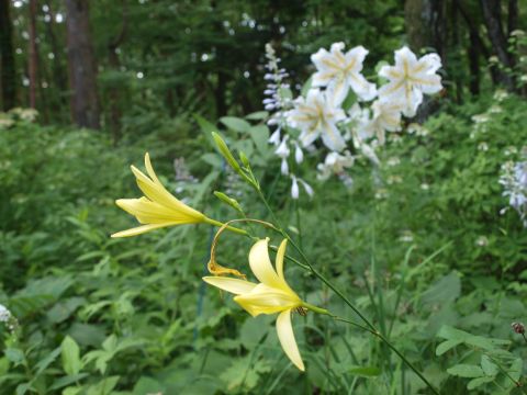 一日花で大好きな花ですが一向に増えないで同じ場所に咲いています。名前のとうり夕方から咲いて朝にはしおれていますが小さな蕾まで咲いてくれます。近くに咲くユリやギボシと緑の中で精一杯咲いています。