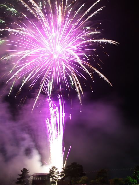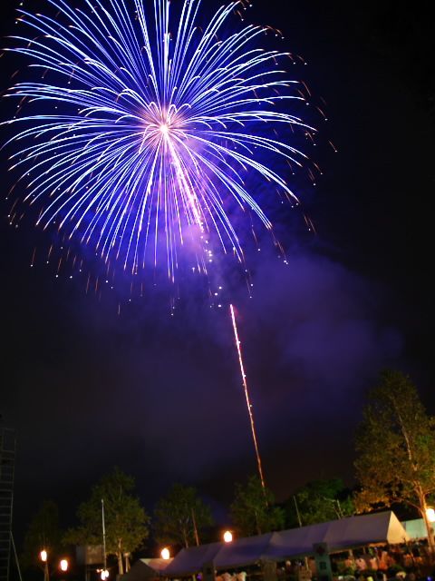 後半は花火が打ち上げられ、夜空に大きな花が開きます。天気予報はいい方にはづれにわか雨も無く無事に終わり、初めて見に行かれたお客様も面白かった綺麗だったと大満足のようでした。