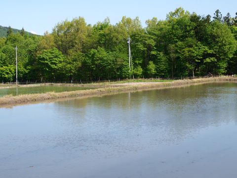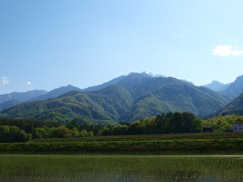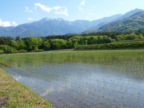青い空・植えられたばかりの苗・その向こうには、萌え出たばかりの緑・山々・それは思わず足を止めて、動けなくなるような美しさでした。
