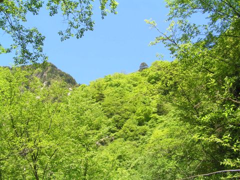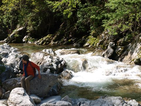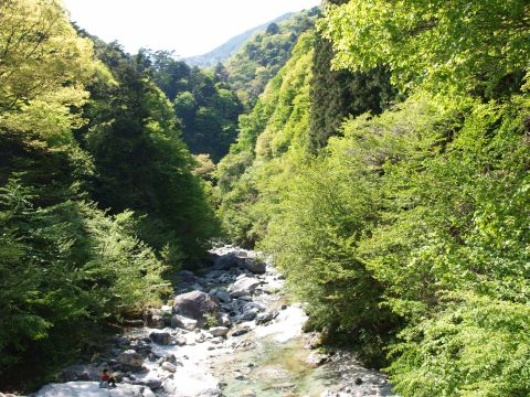 あまりのお天気のよさと、緑に誘われて、尾白川渓谷へ。幾重にも重なる緑と、水は青みを帯びて川底までも透きとうってみえ、岩のところでは流れ落ちる水が白くしぶきのように泡立っています。この自然の中に身をおいた人が、あちこちの岩陰に・・・・。