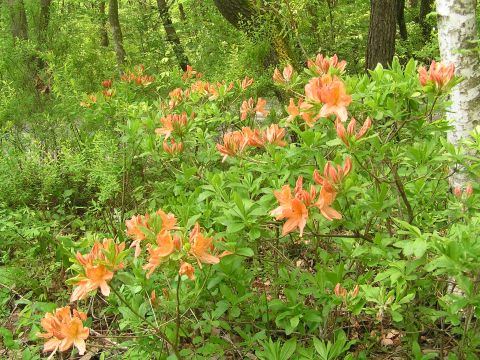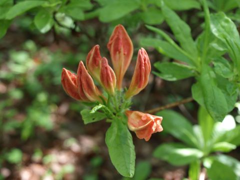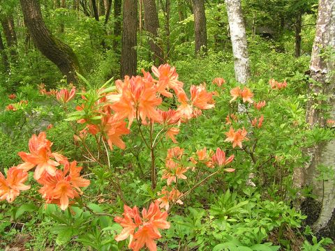 若い緑の中に、レンゲツツジが咲き始め庭が華やかになりました。