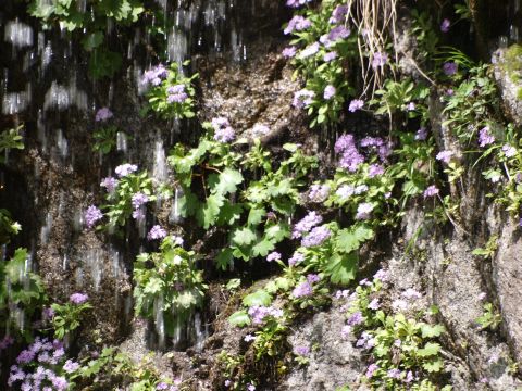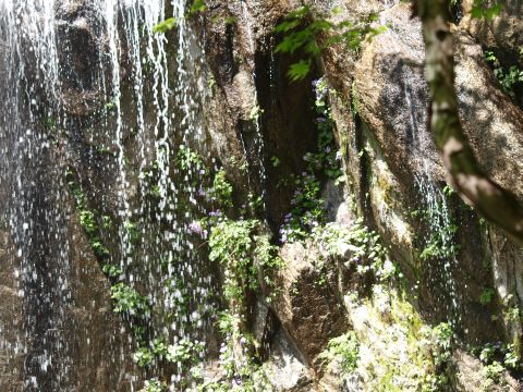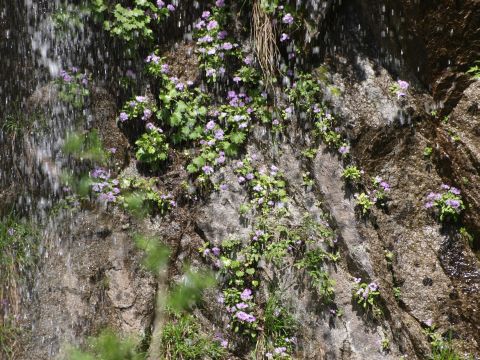 錦滝に到着。あっつ!!丁度見ごろでよかった。今年は気温が定まらなかったので、心配だったのですが・・・・。サクラソウのように見えますが、ユキワリソウなんですね。それも岩肌を流れ落ちる岩肌に根付いて咲いているので驚いてしまいます。岩の穴の中にも咲いているのです。今年もあえてよかった!!。