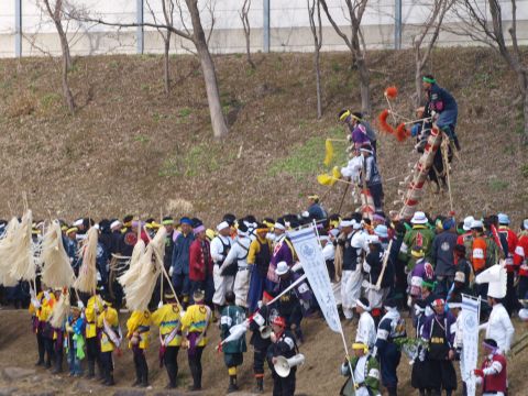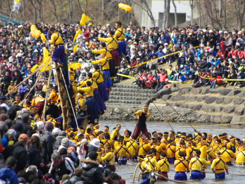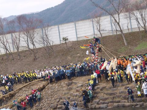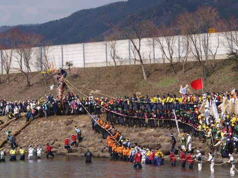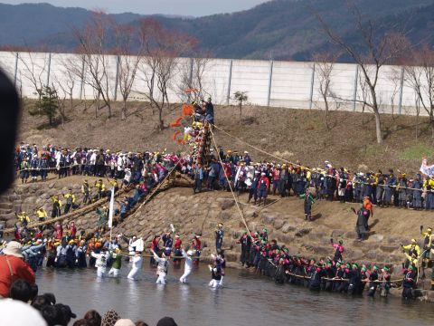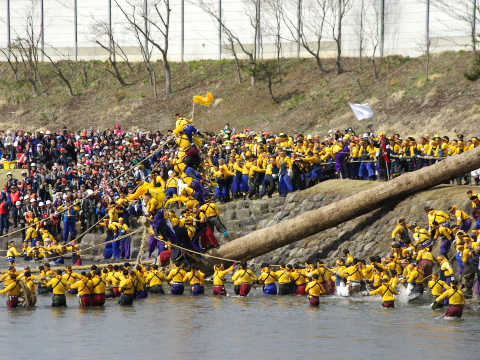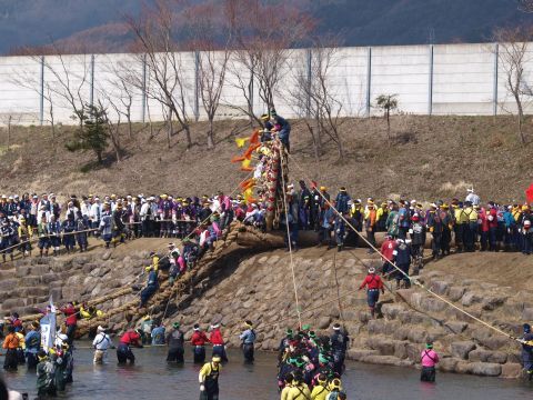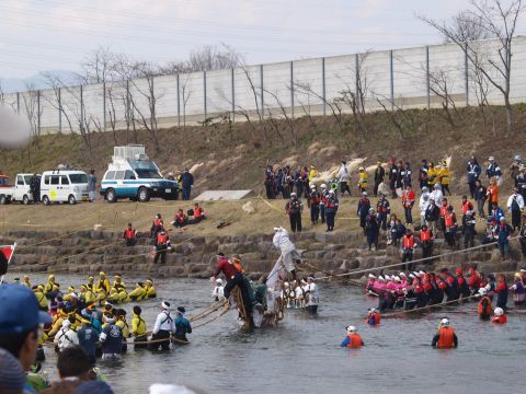 土手を一気にすべり川の中に綱の先端を引く人は早くから川の中で寒いだろうねと思いながら・・・・。川を超えて御柱は対岸の土手を上がります。