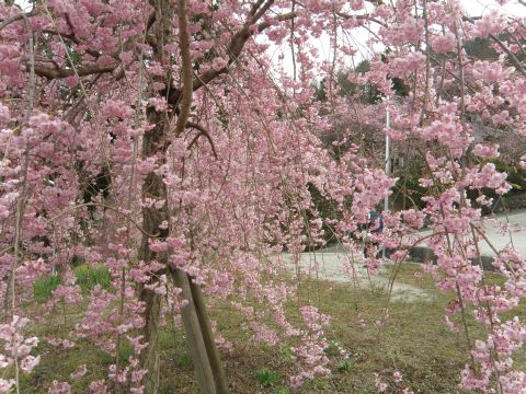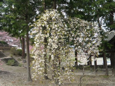 昨夜のお客様にお聞きしたお寺でわに塚から15分ほどの所でした。お寺全体がピンク色に染まりとても華やかな感じでした。枝垂桜ばかりで薄いピンク色から濃いピンク、それに白い枝垂桜が沢山ありおどろきました。花の小さなものから大きなものまで。私は白い枝垂桜は始めてみました。人影もなくゆっくりと見せて頂きました。