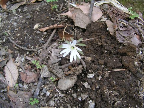 朝からの暖かな日差しを受けてシュンランがさきはじめ、アカバナエンレイソウが遠慮がちに咲いていて、ハンテン木の太い幹の根元に小さなイチゲが立った1本咲いていました。植えた覚えのないところで・・・。植えたところでは葉芽ばかりが出てはなめ芽はなし。気難しい花のようですが・・・・。
