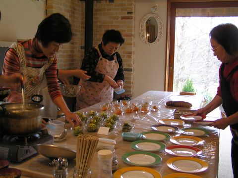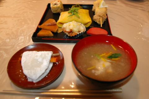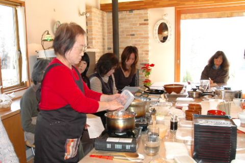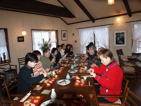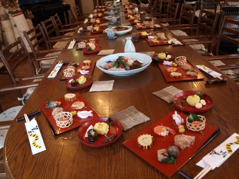 あわただしく過ごすうちにとうとう大晦日。朝窓を開けるとうっすらと雪が・・・・。雪かきをしなくて済んでほっつ!!夜10時に年越しソバを!!。除夜の鐘を聞きながらおめでとうございま〜〜〜す。同じメンバーが多いので話が盛り上がり笑いが絶えません。厨房でその笑い声を聞きながらお節の用意です。