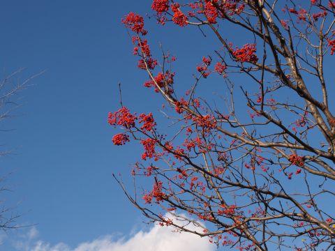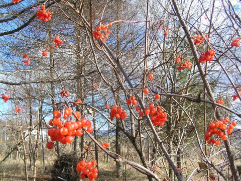 朝起きると落ち葉の上にほんのりゆきが・・・・。晴れてきたので出かけてみましたが、山の頂上付近には雲が上のほうは吹雪いているのでしょう。ななかまどの実がぶら下がり青い空に映えてとても綺麗でした。