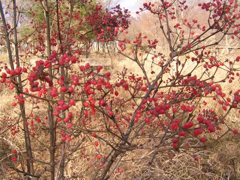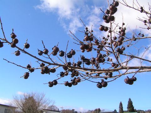 買い物ついでに立ち寄った公園。木々も衣を脱いで乾いた落ち葉がかさかさと音をたてます。何もないなかで赤い実がぶら下がってゆらゆらと風に揺れている2種類の木がありました。ナナカマドとガマズミの実でした。少し先には大きな木に黒い実が沢山・・・・。近づいてよく見ると、えっつ!!柿??1センチにも満たない大きさなのに柿の実そのもので中を見るとちゃんと種も。黒くなる前は矢張りオレンジ色なのでしょうか??来年は早めにみにいかなければ・・・・。