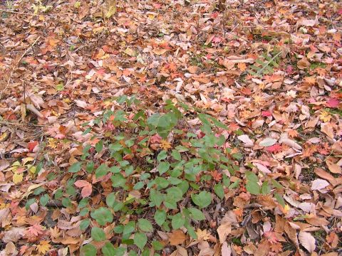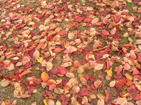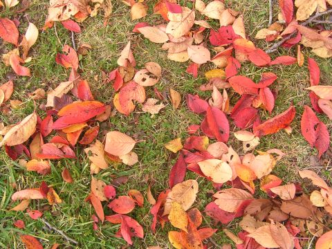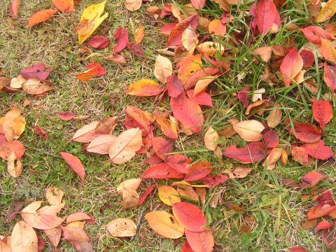 暖かな日が続き過ごしやすいですが、風が吹くとはらはらと葉が一枚また一枚と舞い落ちてきます。庭の木の7割ほどの葉が庭いっぱいに重なっています。落ち葉の中でイカリソウの葉が青々と元気いっぱいです。