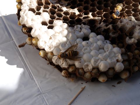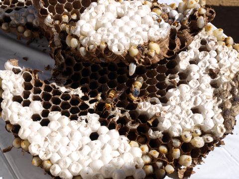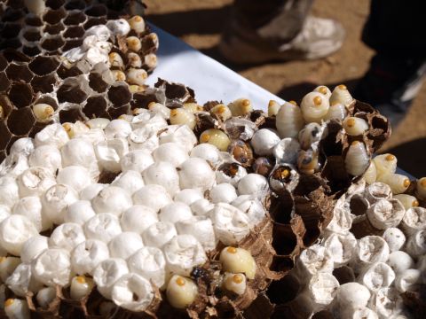 会場でオオスズメバチの巣が一段ずつ分けて台に並べられていて、焼酎にスズメバチをつけて売っていました。皆このような状態で巣を見るのは初めてのようで何時までも人だかりが動きません。幼虫も動いていてつまんで食べている人も!!ミルクっぽくて美味しいとのこと。ウワ〜〜〜いやだ・・・・。こんなに目の前でゆっくりと見たの初めてのことでした。