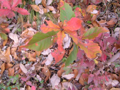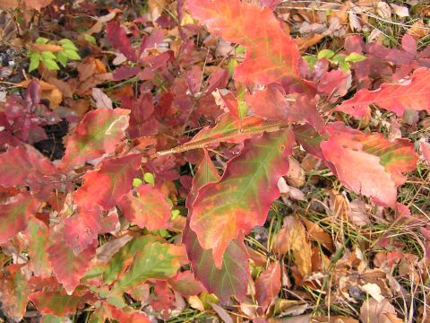 午後からは雨もやんで暖かに・・・。散歩に出ると足元の小さなクヌギの葉が驚くほど綺麗に紅葉していました。ほんの少し居場所が違うだけでこんなに色合いが違うのですね。