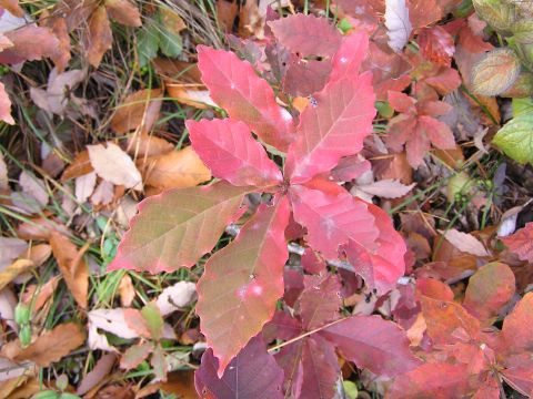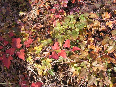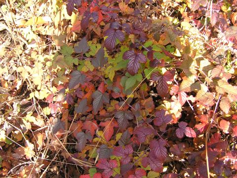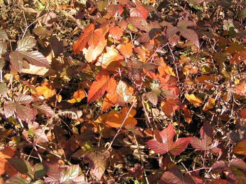 木苺の葉も見事に紅葉していました。その何ともいえない色合いに驚かされます。ほんの少しずつ居場所が違うだけでこんなにも微妙な色合いが出せるなんて太陽は本当に魔術師ですね。