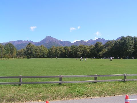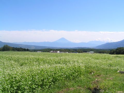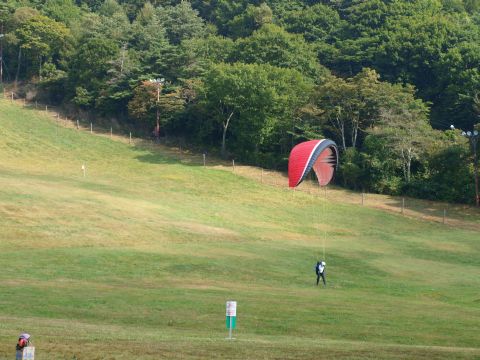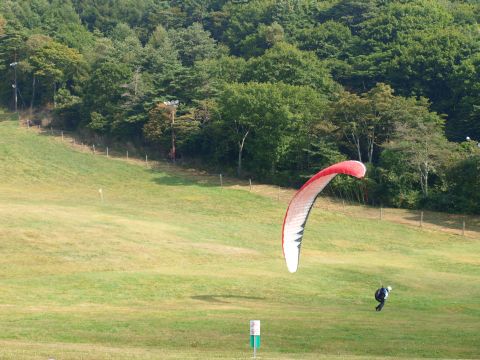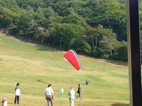 富士見高原でお昼におソバを食べていると、目の前でパラグライダーにチャレンジしている人が・・・、。風にうまく乗ってあっつ!!地球から足が離れた!!と思った瞬間、ふんわりと降りてきました。回りで食事をしている人たちも力が入ります。