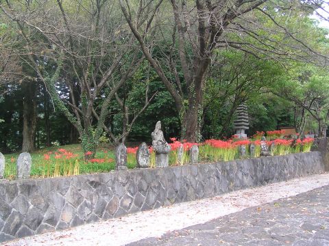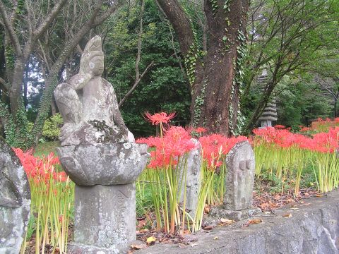 近くの友人に誘われて往復1時間という事でお寺の境内に咲く彼岸花を撮りに行きました。お寺に入るとほのかな甘い香りが漂ってきます・・・見上げると今まで見た事もないような大木のキンモクセイが蕾をいっぱいつけています。これが咲くと香りも花も見事なものでしょう。境内に下りていくと石仏が並んでいて周辺に沢山のヒガンバナが・・・・檀家のかたがたが植えられたのでしょうか??とてもいい風情でした。