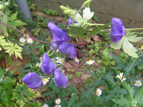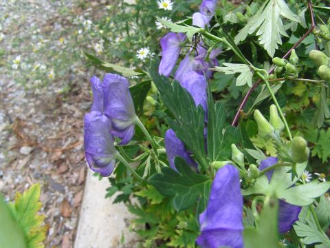 初めての大型連休もお天気もくずれないでほっと一息というところで、久し振りにノンビリと庭を見回すとトリカブトの花が咲き始めていましたが、南側の庭では1本だけで、道路側のは日当たりが悪くなり生育不良でダメ!!北側の道路際では元気よく咲き始めていました。これも上に立つのと、横に伸びるのとが在るようです。