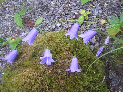 朝晩は肌寒いですが、日中は暑い位です。ふと庭の砂利の斜面を見ると、イワシャジンが横のホトトギスにもたれかかるように咲いていましたのでそっとこけむした岩の上に横にしました。リンドウもひよろひよろと頼りなげに咲いています。大好きな花なのになかなか増えてくれません。