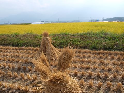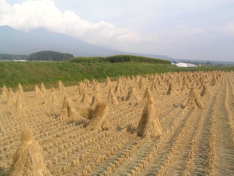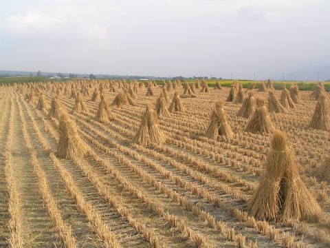 稲刈りの済んだ田んぼでの不思議な光景に出会いました。わらだけが写真のように綺麗に干されていました。お米は??農家の人も見かけなくて聞く事もできないまま・・・・。