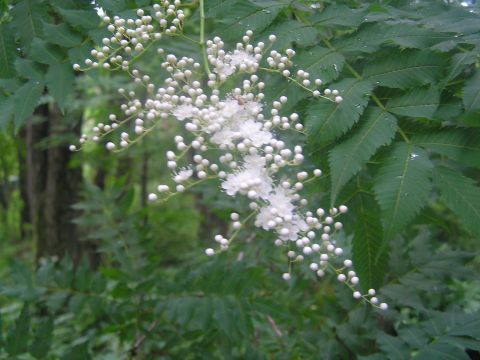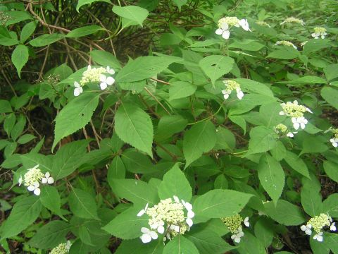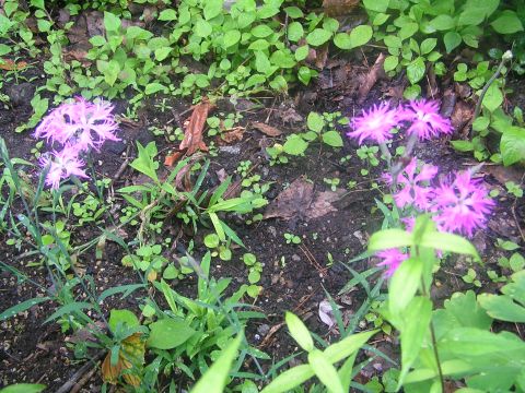小さなアジサイが咲き始めています。大きな株になり梅雨空にはえています。ニワナナカマドが今年も気がつかないうちに3個は咲き終わり最後の1個が咲き始めていました。日当たりが悪いので4個だけより咲きませんでした。緑の葉の陰でかわいいカワラナデシコが咲いています。