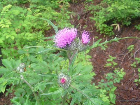 曇り、一時雨が降ったり、薄日が差したりと、一日のうちでめまぐるしく変わります。梅雨なのに今年は一日中降る事が少ないようです。裏の林で1本だけアザミが咲いていました。その足元に朝咲き始めたらしい野ばらがとっても綺麗でシャッターを!!。北側の庭にアヤメが始めて咲き始めました。矢張り太陽が当たるようになったからですね。南にあって一度も咲かないアヤメもこちらえ植え替えないと・・・・・・・。