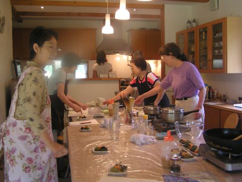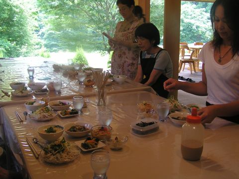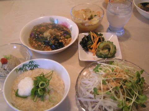 献立は山芋のパワー雑炊・ソバサラダ・ナスのそぼろあんかけ・トマトの重ね煮・ゴーヤの味噌煮・レタスの磯和え・玄米甘酒のアイスクリームでした。いつもの事ながらボリューム満点の美味しい昼食でした。