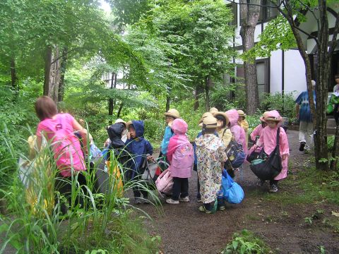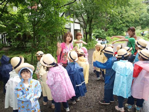わ〜〜雨です。可愛そうに!!でもこればかりは仕方ないですが・・・。子供達は大人が気にするほどではなくそれぞれ、お気に入りの可愛いレインコートを着て、お友達と一緒にいるだけで楽しそう。元気いっぱいです。