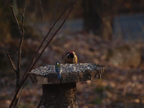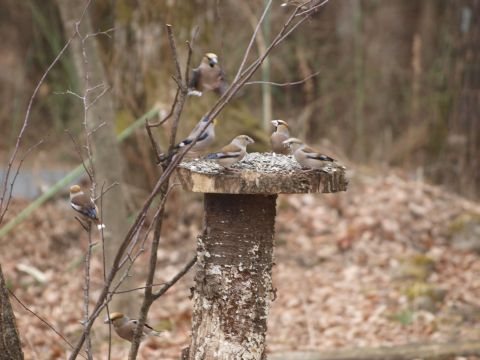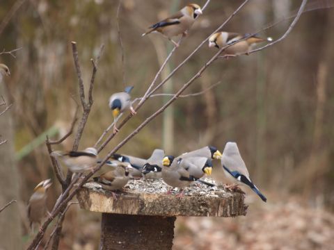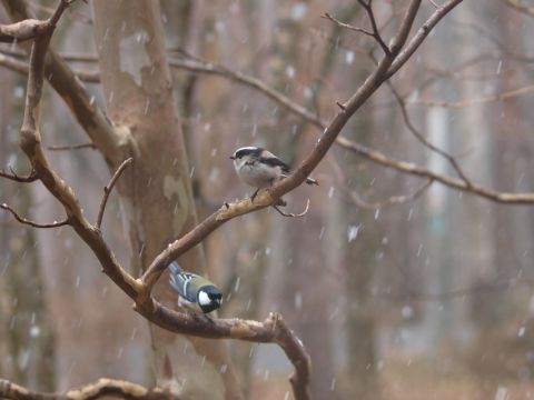 朝から肌寒いと思ったら、雪が舞ってきました。小鳥たちも、入れ替わり立ちかわり餌場に来ます。細い枝の上のほうや下に順番を待っています。この中では右端の写真の黄色いくちばしのイカルが一番強く、真ん中の写真のシメが2番手で威張っています。もちろん仲間同士でも・・・・。本当に人間社会を見ているようでおもわずわらってしまうことも・・・・。餌台の上にこんもりと大盛りでひまわりをあげているのですが一日4回くらい追加します。これからシベリアのほうへ帰る為の準備をしているのでしょう。
