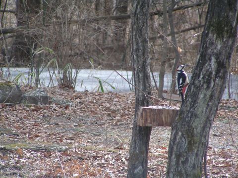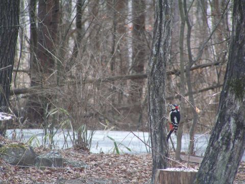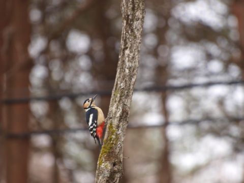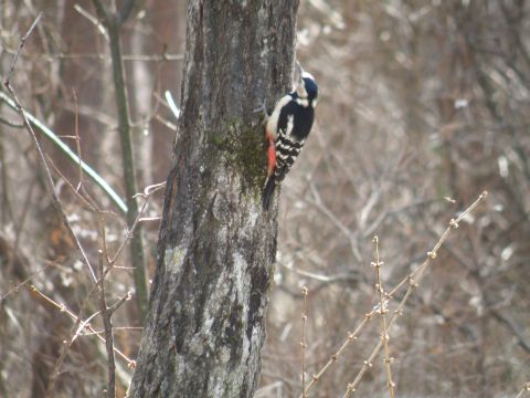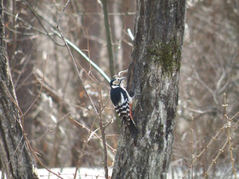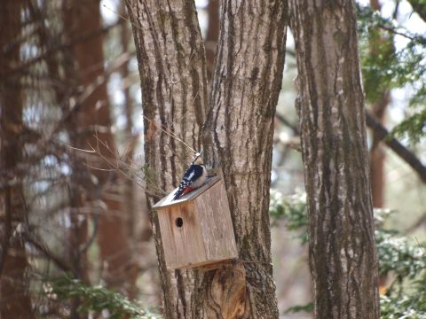 アカゲラのメスですが幹の穴にいる虫を探しているようです。昨年シジュウカラが使った巣箱の上で寝そべっている面白い。写真です