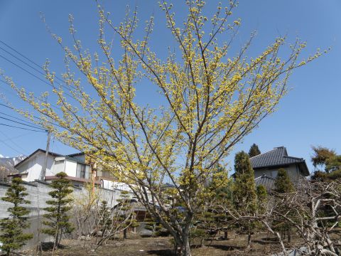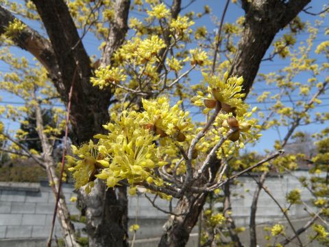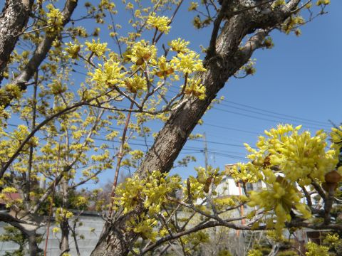 サンシュウユの花がいつの間にか満開になっていました。青い空に黄色がとても綺麗です。