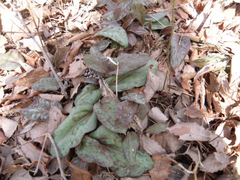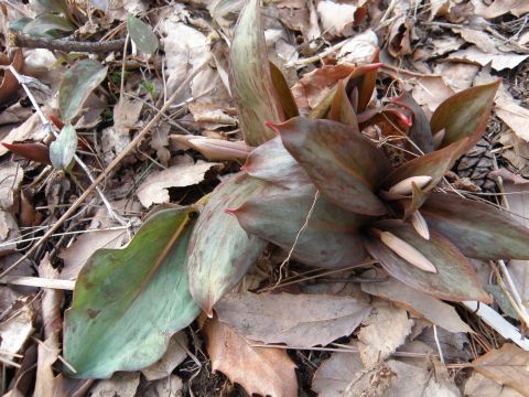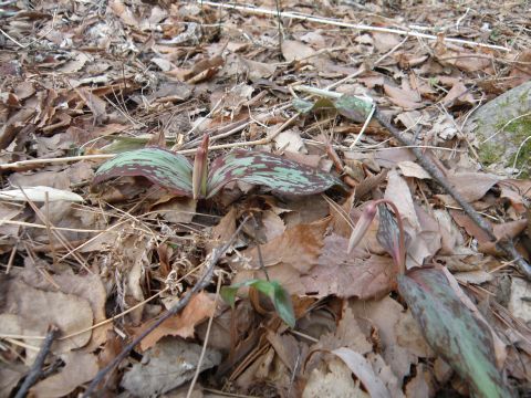 やっと顔をだしました。カタクリが・・・・。枯れ葉をそっとどけてみると、あそこにもここにもと。
